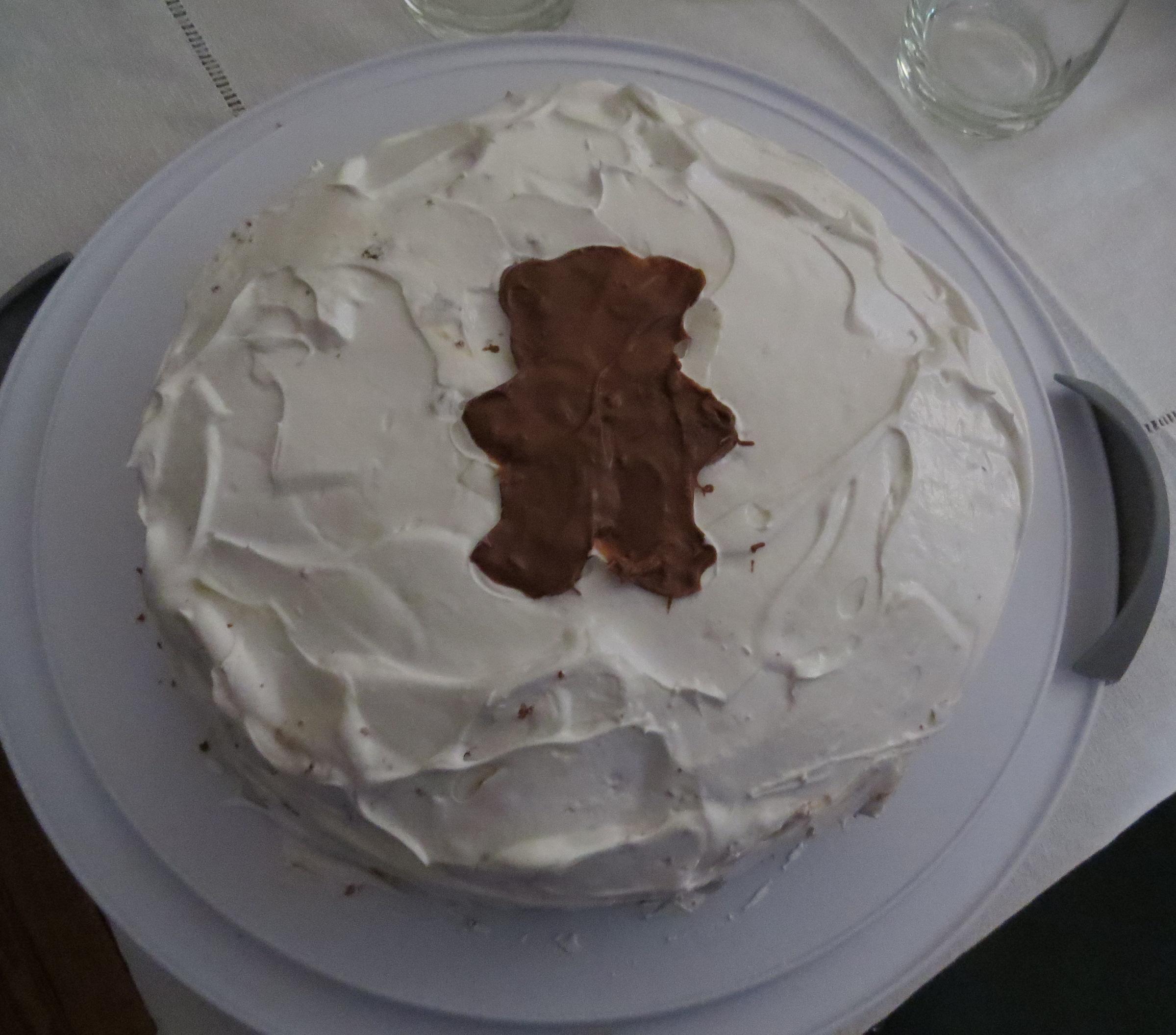 Yo hice la torta negra del diablo con baño de merengue. Y el merengue me salió!! Para hacer el osito, puse un molde de galletita y le esparcí chocolate derretido. Hasta ahí llegan mis habilidades decorativas.